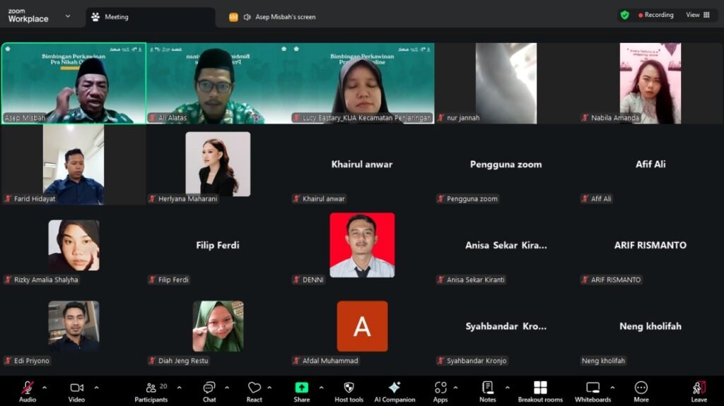 Jakarta, 11 September 2025 – Kantor Urusan Agama (KUA) Penjaringan kembali menyelenggarakan kegiatan Bimbingan Perkawinan (Bimwin) bagi calon pengantin. Program ini merupakan salah satu layanan prioritas Kementerian Agama untuk memberikan bekal pengetahuan, sikap, dan keterampilan kepada pasangan sebelum melangsungkan pernikahan. Kegiatan yang berlangsung secara online melalui zoom virtual meeting. Kegiatan ini dihadiri oleh sejumlah calon pengantin yang sudah mendaftar pernikahan. Dengan suasana penuh keakraban, para peserta mengikuti seluruh rangkaian materi yang disiapkan oleh tim fasilitator dan narasumber dengan antusias dan hangat.